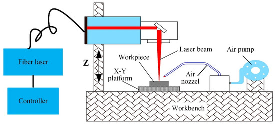 Blowing-assisted laser processing was proposed based on conventional laser processing. As shown in Figure 1, a high-speed galvanometer laser marking machine (MDK-GX-20Z, Suzhou, China) was used for laser processing. The laser device was a fiber laser with a wavelength of 1064 nm, pulse width of 100 ns, and the beam spot size was 0.05 mm. The workpiece was placed on the precision X-Y platform to ensure the processing area was in the center of the galvanometer in each experiment. An air pump with an output pressure of 0.6 MPa was used for auxiliary blowing, the air nozzle size was 3 mm × 6 mm, and it blew air directly into the processing area.