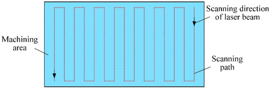 Firstly, the silicon carbide workpiece was processed a different number of speeds by conventional laser processing to obtain the laser processing characteristics of silicon carbide. The same experiments were repeated with blowing-assisted laser processing. Next, comparative experiments between conventional laser processing and blowing-assisted laser processing were carried out for the processing of the groove structures of different widths. Finally, array groove structures were processed by blowing-assisted laser processing, verifying the feasibility of improving the quality of grooves with the assistance of blowing. The laser processing path for the above experiments is shown in Figure 2. The distance between each processing path was 0.025 mm, and the overlap of laser energy was 50%. Other processing parameters are listed in Table 2.