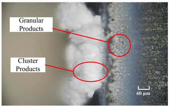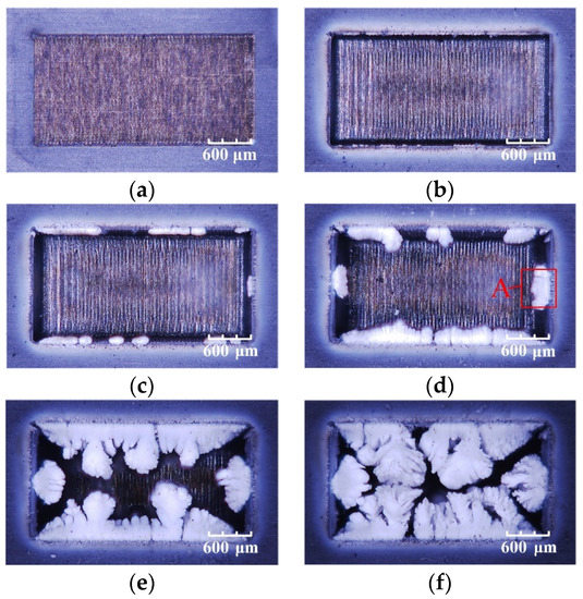 Figure 3 shows the workpiece morphology prior to cleaning after conventional laser processing. Each image shows the material after being processed a different amount of times. In each experiment, the processing area of the groove was 1.5 mm × 3 mm. When the material was processed only 1 time, the material was obviously removed and the outline of the groove was clearly visible, as shown in Figure 3a. When the processing time increased to 50 times, the non-processing area around the groove became white, as shown in Figure 3b. With the continuous increase of processing scans, white products increased and clumped at local contours and gradually extended to the center of the groove (Figure 3c–e). When the processing times was 400 times, white products almost covered the entire area of the groove (Figure 3f). From the magnification of area A in Figure 3d, it can be observed that the white products were granular in the non-processing area outside of the groove, and extended to the processing area in a cluster, as shown in Figure 4.