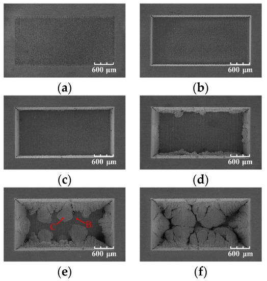 SEM of workpieces processed a different number of times by conventional laser processing after cleaning: (a) 1 time, (b) 50 times, (c) 100 times, (d) 200 times, (e) 300 times, (f) 400 times, B in (e) was the surface of normal machining, C in (e) was the surface of deposit.