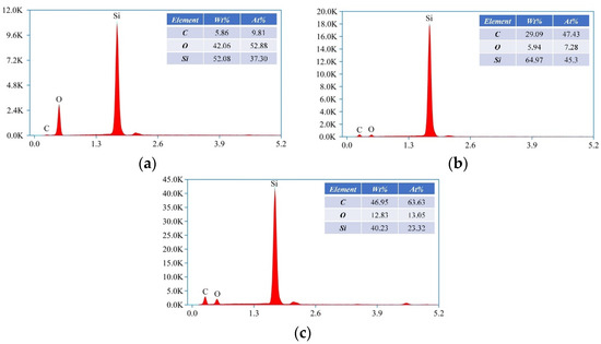 Next, the components of the different processed surfaces shown in Figure 5e were measured by EDS, and the white products on the workpiece surface before cleaning were also collected for EDS measurement. From Figure 6a, it can be concluded that the white products covered on the workpiece surface mainly consisted of Si and O, and also small amounts of C. Therefore, it can be inferred that the white products were mainly SiO2 and a small amount of SiC. The normally processed smooth surface at point B in Figure 5e contained a small amount of oxygen, as shown in Figure 6b, which was due to the oxidation reaction between the material and air during processing. For the surface of the recast deposit at point C in Figure 5e, the main components were C and Si. Therefore, the recast deposit was mainly SiC.