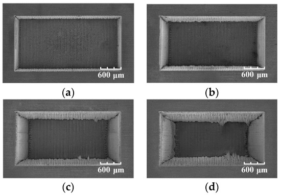 In the bottom of the grooves in the processing area, the laser energy was enough to vaporize the material, and the gaseous products diffused to the outside of the groove and solidified. As shown in Figure 3, oxidation products firstly accumulated around the groove. With the increase of processing times, the oxidation products spread to the center of the groove. Unfortunately, the accumulated products could shield part of the laser energy, and this material was melted and recast. As a result, the poor processing quality was obtained.