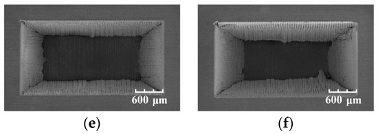 In this section, the groove structures were processed 100 times, 200 times, 300 times, 400 times, 500 times, and 600 times by a blowing-assisted nanosecond laser. The processing area was also 1.5 mm × 3 mm in each experiment, and the morphology of workpieces after cleaning were observed by SEM, as shown in Figure 7. Different from the performance of conventional laser processing, with the increase of processing times, there was no excess melt deposit in groove structures processed by the blowing-assisted laser. Even after processing 600 times, the bottom of the groove was still flat and the quality of the groove was good, indicating that the products had no influence on the processing area in the blowing-assisted laser of silicon carbide. From the above experiment results, it can be concluded that blowing can effectively improve the processing depth and processing quality of groove structures processed by nanosecond laser.