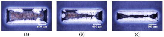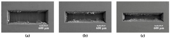 SEM of workpieces of different widths processed by conventional laser processing, shown after ultrasonic cleaning: (a) width of 1 mm, (b) width of 0.8 mm, (c) width of 0.6 mm.