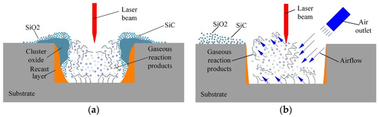 Schematic of material removal in the fiber nanosecond laser processing of SiC material: (a) conventional laser processing, (b) blowing-assisted laser processing.