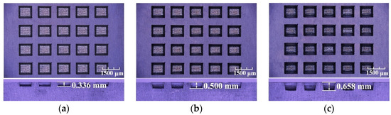 In blowing-assisted laser processing, silicon carbide material was processed normally by the laser, and oxidation products were also formed. As shown in Figure 11b, with the assistance of blowing, the oxidation products could be blown away from processing area. There were only a small amount of products near the groove, which would not affect the processing. With the increase of processing depth and the decrease of processing width of the groove structures, the blowing also effectively removed the products, thus avoiding the accumulation of products in the processing area. Therefore, deeper and narrower groove structures of good processing quality could be obtained by blowing-assisted laser processing. In addition, compared with conventional laser processing, waste products could be removed from the processing area more quickly before they had a chance to react, enabling the blowing-assisted laser processing to obtain higher processing efficiency. To further verify that blowing can improve the laser processing capability of silicon carbide, array microgroove microstructures of 1 mm × 1 mm were processed 100 times, 150 times, and 200 times by blowing-assisted laser processing. As shown in Figure 12, the contour of array grooves were clear and the bottom of the groove structures were bright without molten deposits. From the cross-sectional profile, it can be found that the depth of the groove structures gradually increased with the increase of processing times. The processing depth of 1 mm × 1 mm array grooves can be 0.658 mm when processed by the blowing-assisted laser processing 200 times. It can be concluded that blowing-assisted laser processing is more suitable for the processing of microstructures on silicon carbide materials, compared with the conventional laser processing.