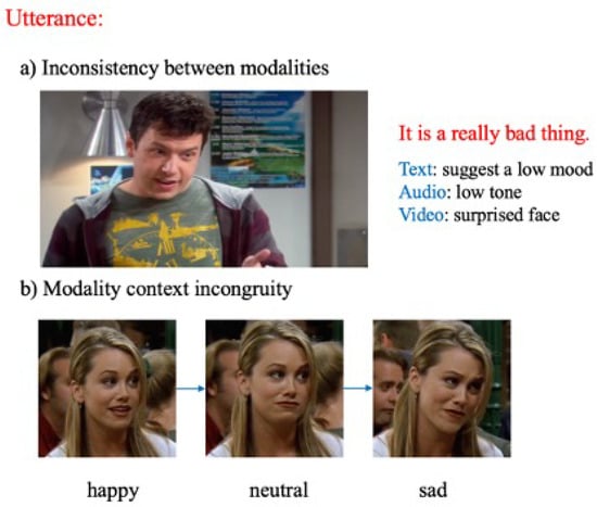 Traditional sarcasm detection methods can be divided into three categories. The first category is based on text data. By capturing the inconsistency between texts, many sarcasm detection methods have been proposed [2,3,4,5]. However, these methods only detect sarcasm through textual data, ignoring the incongruity of information between different modalities. The second category includes methods based on images, text, and data seen from images (attributes, objects, text, descriptions, etc.) Cai et al. [6] constructed a multimodal dataset and proposed a new hierarchical fusion model to fully utilize the information of three modalities of image, text, and image attributes to solve the problem of sarcasm detection. Yao et al. [7] proposed a multi-modal, multi-interactive, multi-level neural network. This model takes images, texts in images, image descriptions, and Twitter text data as inputs and detects sarcasm by stimulating the brain’s first-order and second-order understanding of sarcasm. Pan et al. [8] proposed an architecture based on the BERT model and found inconsistencies among multimodalities. However, such methods rely heavily on the clarity of the image and the data detected from the image. However, with the advent of the short video era, people are more willing to share short videos to record their lives on the social media platforms Twitter and TikTok. Therefore, only modeling text and image data are not enough to detect sarcasm. From this, the third category of sarcasm detection methods is derived—video, text, and speech-based methods. Castro et al. [9] proposed the first sarcasm detection dataset based on text, speech, and video data. They extract text, speech, and video features separately and concatenate the features of the three modalities as the input of the SVM classifier. However, the SVM algorithm is difficult to implement for large-scale training samples, and the algorithm is also sensitive to missing data and parameters, as well as the choice of kernel functions. In addition, taking vision as a modality and simply concatenating the features of each modality is unfavorable for sarcasm detection. Wu et al. [10] argue that previous work did not explicitly model the incongruity between modalities. Therefore, they propose an incongruity-aware attention network (IWAN) to detect sarcasm through a scoring mechanism for word-level incongruities between modalities. Chauhan et al. [11] believe that contextual and multimodal information is sometimes unhelpful for sarcasm detection, so they extended the dataset proposed by Castro et al. [9] using emojis and offered an emoji-aware multitask deep learning framework. However, such methods have a disadvantage in that the training speed is slow, and it ignores essential information, namely, that there is a large amount of data irrelevant to sarcasm detection in the video modality, such as the background information in the video.