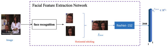 Face Image Features: as facial information contains emotional information related to sarcasm detection, we believe that the video modality should focus on the person’s news rather than the image’s background information. The network architecture of facial feature extraction is shown in Figure 3. First, we use the face detection model provided by DLIB (http://dlib.net/face_detection_ex.cpp.html, accessed on 13 August 2021.) to detect the face of each frame in the video conversation. Let denote the maximum height of the face image seen from each image frame. Since the size of each face detected in the face detection process is inconsistent, the black block is used to fill the vacant part in the splicing process. After the filling operation, the heights of all face images are uniform. Then, a horizontal stitching operation is performed on all faces to obtain the final image input to the network. The formulation is as follows.