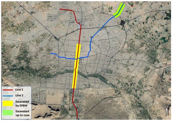 The first line of the Isfahan metro starts in the northwest and finishes south of Isfahan. As seen in Figure 1, about 5 km of this line have been excavated by EPBM. The tunnels were two directional, with an excavation diameter of 6.9 m and a finished diameter of 6 m. The geology along the route comprises river sediments mainly consisting of sand, gravel, and clay, with some cemented lenses in the southern parts of the route. The general specifications of the utilized EPBM are shown in Table 1.