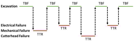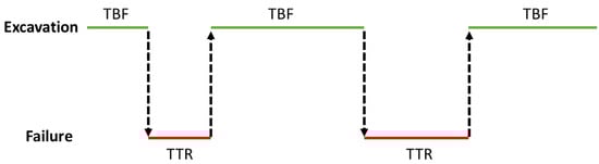 It is crucial to define related parameters to perform a RAM analysis. TBF and TTR parameters are defined as the time between the breakdown of the EPBM and the time needed to carry out repairs, respectively, as shown in Figure 2. Using a database containing these parameters during a specific period for each subsystem, the mean values of these parameters can be calculated as MTBF and MTBR. From these mean values, failure rate (λ) and repair rate (μ) can be calculated as follows [3,24]: