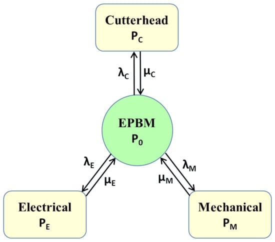 As there is a relationship between the EPBM subsystems (electrical, mechanical, and cutterhead), availability for each subsystem, and the whole EPBM, can be defined based on network modeling using the following equations [25]: