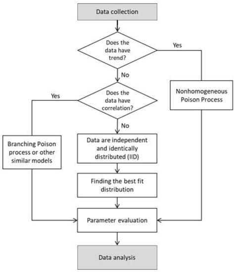 First, the database’s trend and serial correlation tests are carried out. As shown in Figure 6, if the data follow a trend, then the NHPP method should be used; otherwise, the serial correlation test should be performed to determine whether the data are dependent or independent. If the data are dependent, the HPP method is used; otherwise, a renewal process (RP) is used based on the probability density function with continuous distribution. Following the determination of the TBFs and TTRs for each subsystem, the two mentioned tests can be performed as presented in [28]. The Trend test is performed by analyzing the data and calculating the statistical value, U, using the following equation: