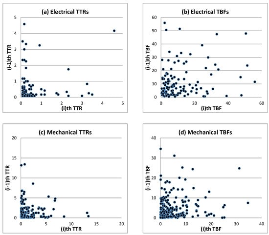 Under the null hypothesis of no trend, the test statistic U is chi-squared distributed with 2(n − 1) degrees of freedom (the number of independent grids in the system). A null hypothesis is not rejected if the test statistic U is located between the values of Chi2 in lower and upper levels of significance [29]. Serial correlation tests are performed by plotting the (i)th TBF or TTR against the (i − 1)th TBF or TTR. If the plotted points are scattered with no apparent pattern, the TBFs or TTRs are independent, and have no serial correlation [30,31].