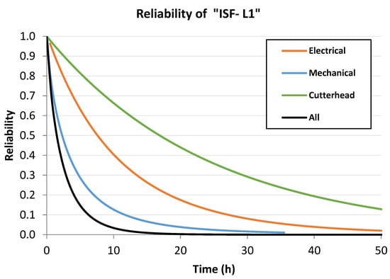 Table 7 shows that the probability distribution is not exponential in all subsystems. In other words, and are not constant in all subsystems. This suggests that the Markov method cannot always be used for R(t) and M(t), which is contrary to the conclusions presented by [4]. The analysis of each subsystem has been determined based on the tests’ results. Subsequently, reliability and maintainability diagrams for each subsystem and the EPBM have been produced, as presented in Figure 7 and Figure 8. As seen in Figure 7, the reliability of the whole system is close to that of the mechanical subsystem, indicating that by performing scheduled repair and maintenance on the mechanical subsystem, the reliability of the entire system will also improve. Figure 8 suggests that the maintainability of the whole system significantly depends on the maintainability of the cutterhead.