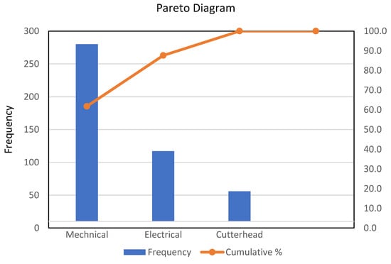 The RAM analysis for Line 1 of the Isfahan metro is presented using two different methods. The results indicate that the Markov method should be performed for the availability analysis, and the reliability and maintainability analysis should be completed according to the probability distribution function of each subsystem. The Pareto diagram was developed to see the frequency of EPBM failures in Line 1, which is presented in Figure 9. This diagram shows that more attention should be given to the mechanical subsystem concerning planning and maintenance for a successful project. Further, based on observations and the maintainability diagram, cutterhead inspection is the central aspect of maintenance time.