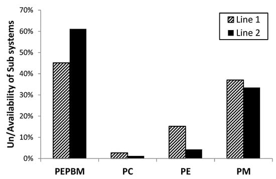 As Table 10 and Figure 11 show, the unavailability of all subsystems has decreased for Line 2. The availability value increased from 45% in Line 1 to 61% in Line 2 by successful PM. The presence of skilled staff, effective supervisors, and improvement in some parts of the EPBM have been the key contributors to this improvement.