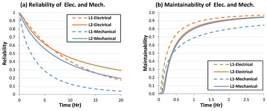 According to Table 9, it can also be seen that the mechanical subsystem has the most improvement both in λ and μ. The reliability value has improved because of PM works. Table 8 and Table 9 indicate that MTBF/λ of all subsystems has significantly increased/decreased. This can also be due to the timely repair and maintenance during dead working times. Figure 12 shows that the reliability of the whole system in Line 2 (unlike the maintainability) has improved compared to Line 1. Reliability-based preventive maintenance time intervals for 80/65/50 percent of the reliability level for Lines 1 and 2 are 0.4/0.9/1.5 and 0.8/1.6/2.7 h, respectively.