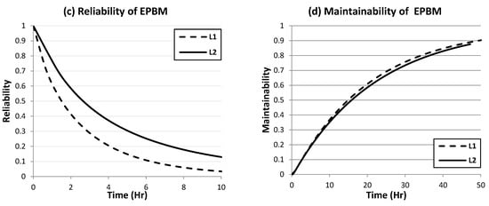 Reliability (a,c) and Maintainability (b,d) of EPBM and two subsystems in Lines 1 and 2.