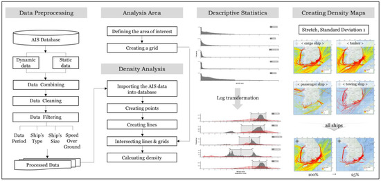 In this study, the ship occupancy time in each cell was calculated by density analysis using AIS data and a density map was created from the results. Figure 1 shows a flowchart of the study process. First, a large volume of AIS data was preprocessed with Python, and the extracted data were divided into data period of season, ship type, length, and speed. Then, in the geographical information system (GIS), the spatial extent of the area of interest (AOI) was defined and the grid of a certain size was created. The densities were calculated using structured query language (SQL) by importing the preprocessed AIS data and grid cells into database. The density values were subjected to descriptive statistical analysis and the data were scaled via log transformation. Finally, a density map was created in GIS environment using a standard-deviation-based stretch symbolization method. After visualizing the traffic patterns for each type of ship, the high-density areas were quantitatively extracted by adjusting the color ramp ratio of the stretch with the density values of all ships.
