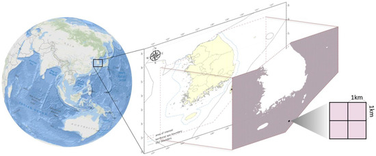 Analysis area covering the coastal waters of Korea and the grid composed of 1 km × 1 km cells.