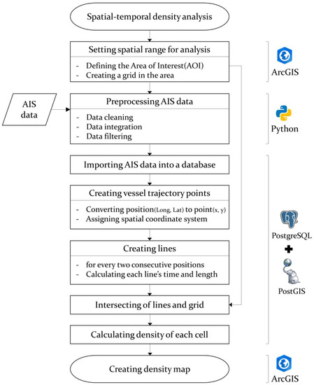 Flowchart of the proposed maritime traffic density analysis using an automatic identification system (AIS) data and density map creation.