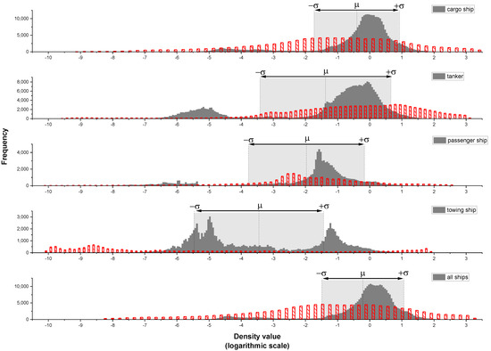 The density calculation results show a broad statistical distribution with large skewness and kurtosis values. The analyzed datasets reduced the normality because they are asymmetric and heavily concentrated around the mean. In general, values that range by orders of magnitude are logarithmically scaled to close the gap between the large and small values while reducing the skewness and kurtosis. The logarithmically scaled dataset with increased normality is suitable for a broad range of data analysis [49]. In this study, the density distribution was logarithmically scaled to improve the visibility of low values in particular. Figure 5 shows the histograms developed by applying a logarithmic scale to the density analysis results of each ship type and the set of all ships. After log-transformation, the data distribution closely approached the normal distribution.