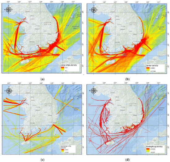 Figure 6 shows the visualization results of the density calculations for each ship type. The traffic density of cargo ships was high along the coast from Incheon to Donghae, and the routes of ships entering and departing from major domestic ports were clearly evident. In addition to coastal routes such as harbor approach routes and coastal access routes, open-sea routes with low density values were clarified. However, tankers were reported at high density in Ulsan, which handles voluminous liquid cargo. Other tanker routes, namely, to Incheon, Pyeongtaek, Daesan, Gunsan, and Yeosu, demonstrated high densities too. The tanker density on the route around the coast was similar to that of cargo ships along the west and south coasts but lower than that of cargo ships along the east coast. Passenger ships were divided into domestic and international routes. The domestic passenger ships traveled from Jeju to Mokpo, Wando, and Geomundo, along simple routes between Pohang and Ulleungdo, and along major routes between islands. The international passenger ships traveled between Japan and Busan and between China and Incheon, Pyeongtaek, and Gunsan. Towing ships demonstrated a more irregular traffic pattern than the other three ship types, with complex and variable routes. They included a route from the coast to the open sea (probably taken by rather large towing ships) and a route within the waterway (probably taken by small tug boats supporting port entry and exit).