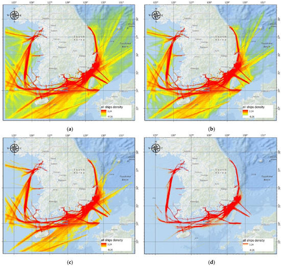 Figure 7a shows the result of merging the density analysis results across all ship types. By adding the four-month density analysis values of the cargo ships, tankers, passenger ships, and towing ships, we can determine the customary maritime traffic flows of major ships through the coastal waters of Korea. Open-sea routes were identified as routes in the ocean and the near-seas connecting coastal routes, whereas inland routes were identified between islands and through relatively narrow waterways. Routes designated for entering and exiting ports, which can be potentially utilized under the current Maritime Safety Act, were identified, in addition to coastal access routes connecting coastal and inland sea routes with port entry and exit routes.