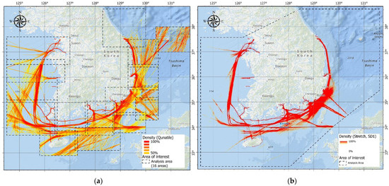 Comparison of ship traffic densities in the coastal area of Korea analyzed and visualized using two sets of methods: (a) Lee et al. [31] used the top 50% of total traffic volume for route extraction via the line density analysis and quantile methods; (b) the present study uses the top 25% of the total traffic volume for main route extraction using spatial-temporal density analysis and standard-deviation-based stretch symbolization.
