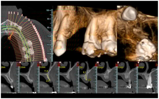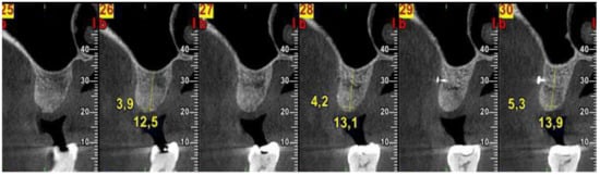 The patient was a 56-year-old male with history of periodontal disease, had lost 24–25 six years before consultation and at the time was looking to replace both. His teeth had migrated in the meantime and tooth 26 had a 9 mm pocket probing depth (PPD) on its mesial aspect. The shift of the molars closed the interproximal space; therefore, the treatment plan for the area was the horizontal augmentation of the edentulous space and an attempt to regenerate as much attachment as possible at the mesial of 26. The plan after that would be to place a single implant at the site of 24 to avoid a tooth of incongruous size. CBCT (Figure 1) shows the local anatomy at baseline.
