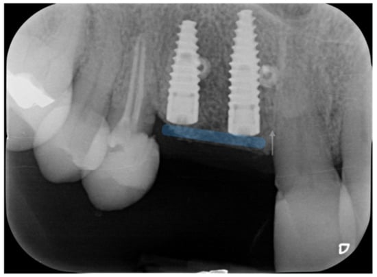 The radiographs at baseline and after completion of the prosthetic restoration also show the GTR effect of GBR in this case on the natural teeth, aside from the expected effect on bone and implants. Both bony peaks to the distal of 11 and mesial of 14 are coronal to the head of the fixture and support interdental papilla (Figure 20 and Figure 21). It is possible to appreciate in the radiographs the stability and good mineralization of the grafted area.