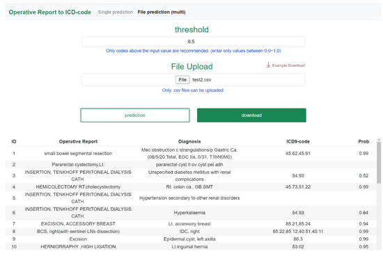 Based on this model, we developed a web application. The front-end was implemented using Vue.js, and the model server was implemented using TorchServe. The model used for the web application was trained using all the data. The classification speed of the model processes 34 data per second, and the web application is capable of both single prediction and multi-prediction. On the single prediction page (Figure 3), the corresponding ICD-9 code and probability can be obtained by entering the name of the surgery and diagnosis. On the multi-prediction page (Figure 4), the ICD-9 codes and probabilities for multiple operative reports and diagnoses that can be obtained through the CSV file upload are presented.