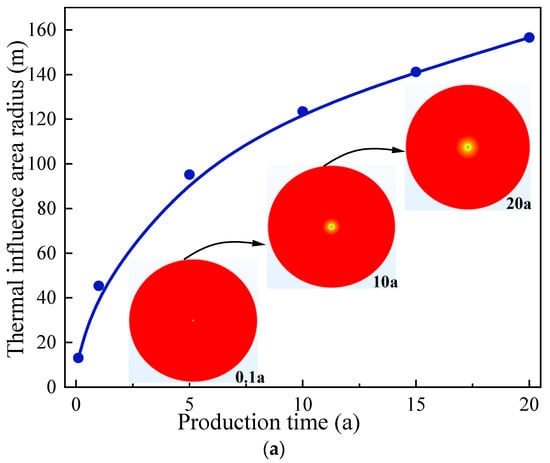 The thermal influence area radius is used to determine the influence scope and provide guidance for the spacing design of the structure. This value refers to the radial distance when the temperature closes to the initial temperature in the surrounding rock. In this paper, line ab (see Figure 8 and Figure 9) is selected to investigate the temperature distribution along the radial direction and to determine the maximum influence radius. Figure 10 illustrates that the thermal influence area radius increases with time, while the increase rate of the thermal influence area radius decreases with the production time. For the near-field model, the thermal influence area radius increased by 82.12 m from year 0.1 to year 5, but only increased by 15.42 m from year 15 to year 20. Meanwhile, for the far-field model, the value increases by 60.79 m in the first 4.9 years but only by 23.82 m in the last 5 years.