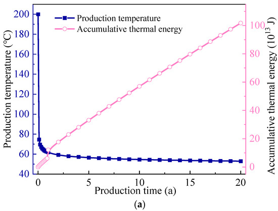 For the convenience of analysis, the production temperature and accumulated heat energy were used to characterize the heat extraction performance of EGS-E. The temperature at the end of the tunnel and the SRV can be considered as the production temperature of the working fluid [39]. The accumulated thermal energy refers to the cumulative amount of heat extracted by the working fluid during operation [40], which is calculated as: