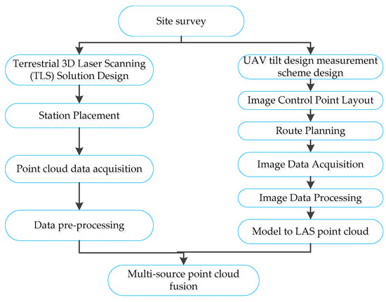 - Ground 3D laser scanning and UAV photogrammetry technology can rapidly and efficiently obtain high-density, high-precision 3D point cloud information under complex geological environment conditions. However, both technologies have their drawbacks. The ground 3D laser scanning technology can achieve highly precise measurement with a scanning error of 2 mm–6 mm, but it is difficult to obtain complete point clouds under complex terrain environments such as those with large height differences. The UAV tilt photogrammetry technology is prone to camera distortion and blurred images, which leads to low measurement accuracy and large data errors. By adopting the unified coordinate system and improved ICP algorithm for point cloud fusion, the photogrammetric point cloud is used to supplement the missing part of the 3D laser point cloud, which not only ensures data integrity but also data accuracy. The fusion accuracy error is less than 2.8 m with a better fusion effect. This method can provide an accurate data source for the intelligent identification of discontinuous surfaces of special geological rock masses, such as high and steep cliffs, and ensures the accuracy of the identification. This is of great importance in geological investigations.