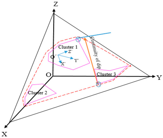 - Based on the 3D point cloud, the normal vector of the point cloud is calculated using an improved nearest-neighbor search algorithm and transformed into the rock body yield (dip angle and dip direction). Combined with KDE and DBSCAN clustering algorithms, the rock body discontinuities are grouped dominantly and the yield spacing and continuity of the rock body are calculated. This method can quickly obtain the rock mass production information, and the results are similar to the measured production and meet the accuracy requirements. In addition, this method can greatly reduce the geologists’ field workload and lower the time cost. However, this method also has some drawbacks, as Chen et al. [15] pointed out; when discontinuous surfaces are extracted from 3D point clouds and clustered using the DBSCAN algorithm, although the method has good robustness to noisy points, it still needs to combine density peaks and manually set the number of clusters, and the degree of automation and intelligence needs to be improved.