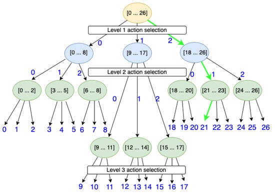 In Equation (4), the coefficient represents the number of action component selection nodes or agents at the level th. The value for shifts the integer values of the action components to particular output ranges. This results in having only one agent per level, as shown in Figure 3. This action decomposition scheme shows that, instead of having a single reinforcement learning agent explore and learn an entire action space of , which can be extremely large, a few smaller reinforcement learning agents can be used to explore and learn in a much smaller version of the action component subspace. The outputs of these smaller agents are then chained together to produce the final action. The complexity of having multiple agents on different levels is similar to traversing a tree in computer science. The number of levels L is of the order of . As a result, only a handful of agents are required to construct an action space even if there are millions of possible actions.
