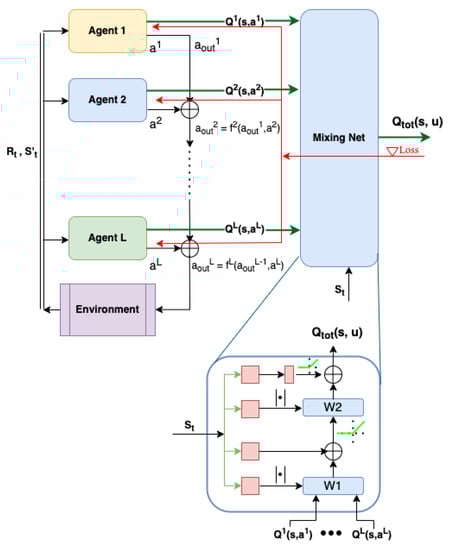 To provide a sound theoretical guarantee of convergence with CRLA, we adapted a well-known multi-agent training network called QMIX []. QMIX trains an individual agent’s network properly while taking the changing policies of the other agents into consideration. QMIX is shown in the right half of Figure 3 under the name Mixing Net. Generally, QMIX enables the training of a joint action value function by aggregating all the individual functions and optimising a combined action value function with .