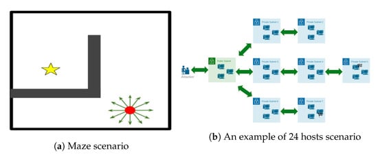 Two simulated scenarios. (a) A toy-maze-based scenario. (b) A CybORG scenario of 24 hosts.