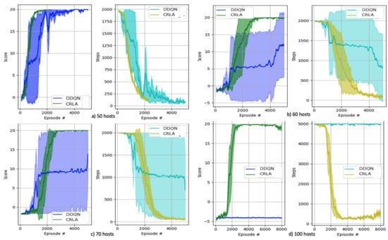 Figure 7 presents the algorithms’ performance on four scenarios where the complexity was significant enough to showcase the superiority of the algorithm while not being too computationally expensive for repeated training. In scenarios where both DDQN and CRLA were able to learn the optimal policy, CRLA showed faster and more stable convergence than DDQN. DDQN’s performance on scenarios with 60 and 70 hosts was unstable as it only successfully learned the optimal policy in one out of four runs. In contrast, CRLA held up its performance on the scenario with 100 hosts where DDQN failed to achieve any progress during training.