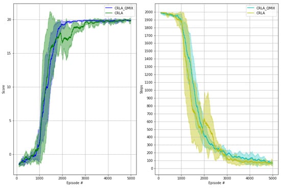 Figure 6 presents a performance comparison of policy training between a single-agent DDQN and the proposed CRLA architecture. The tested scenario had an action size of 4096 with actuators. The results were reproduced over multiple random seeds with the shaded regions showing the variances between runs. The left panel shows the cumulative scores of the agent as the training proceeded, while the right panel shows the number of steps required to reach the goal. Ideally, the cumulative scores would increase towards a maximum reward at the end of the training and the number of steps would reduce to a stable value.