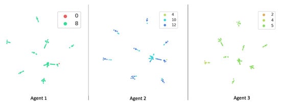 To examine how well each agent in CRLA learned, we looked into the state and action representations that the trained agents learned by visualising the state representations using the t-SNE method []. Figure 9 shows the results. As can be seen, the state representations for the 50-host scenario were quite similar across the three agents. Surprisingly, the learned state representations were mapped into nine separate clusters, which matched the nine private subnets in the 50-host configuration. This configuration itself had one public subnet and nine private subnets, each with five hosts, even though this knowledge was not provided or observable by the agents. The coloured markers represent the identifier of the action component each agent would take in certain states. The action space of 1326 was mapped into smaller subsets of 10 to 15 action components per agent.