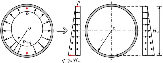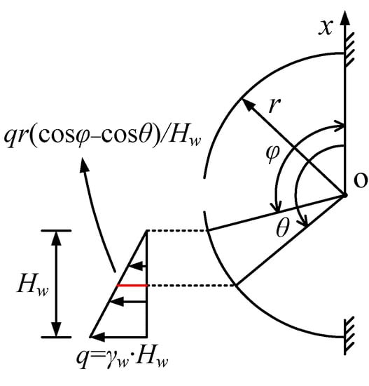 According to the basic structure in Figure 2, a structural load diagram is established under the condition that the pressureless water level is at the upper part of the tunnel, as shown in Figure 5. The height range of the water level is r ≤ Hw ≤ 2r and the value range of φ is 0 ≤ φ ≤ π/2.