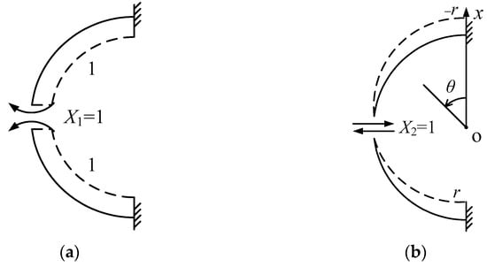 According to the modified routine method, it is stipulated that the positive and negative signs of internal forces are as follows. The bending moment is positive when the inner side is tension; the axial force is positive when this is compression; the shear force is positive with the counterclockwise direction around the isolator [10,14]. The unit bending moment diagrams and are shown in Figure 3.