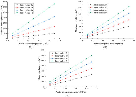 In order to reveal the influence of water conveyance pressure on the maximum internal force of the lining, four working conditions are selected with tunnel inner radii of 2, 3, 4 and 5 m. The maximum internal force under the water conveyance pressure of 0.1, 0.2, 0.3, 0.4, 0.5, 0.6, 0.7, 0.8 and 0.9 MPa were calculated, respectively. The positive and negative value of internal force only indicates the direction of the force. The bending moment and shear force are the maxima of absolute value and the axial force is the inverse of the minimum value (i.e., the maximum axial tension). The curve of the maximum internal force with water conveyance pressure under four lining sizes is shown in Figure 7.