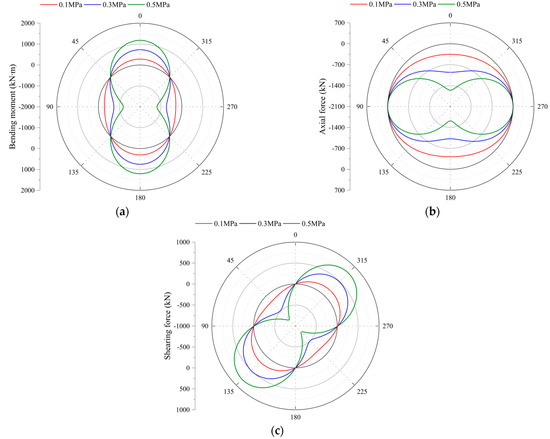 Influence of pressurized water conveyance pressure on internal force distribution of lining. (a) Bending moment distribution diagram. (b) Axial force distribution diagram. (c) Shear force distribution diagram.