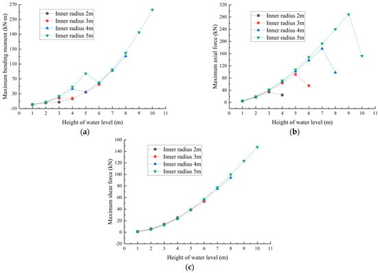 To reveal the influence of water level on the maximum internal force of lining, four working conditions are selected of tunnel inner radii 2, 3, 4 and 5 m. The maximum internal force is calculated by taking an analysis point at an interval of 1 m from 1 m water level to full water level height. The positive and negative value of internal force only indicates the direction of force, and the selection of the maximum value of each internal force is the same as that in Section 3.1.1. The curve of the maximum internal force with water conveyance level under different lining sizes is shown in Figure 9.