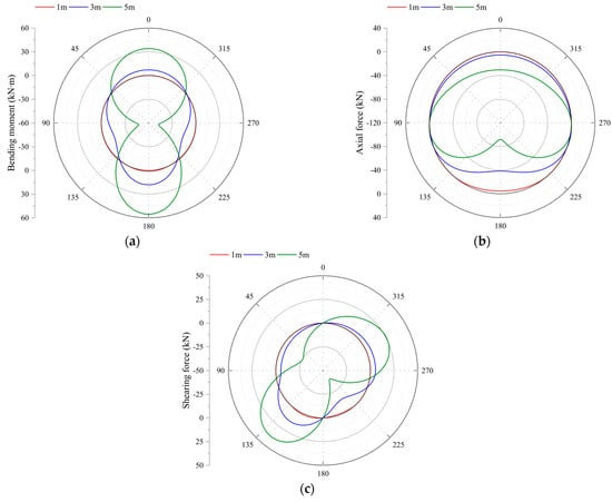 To analyze the influence of water level on the internal force distribution of lining, a tunnel with an inner radius of 3 m is taken as an example and the internal force values of lining at different angles at 1, 3 and 5 m water levels are calculated, respectively. Figure 10 shows the distribution of lining internal force values with angles under three water levels.