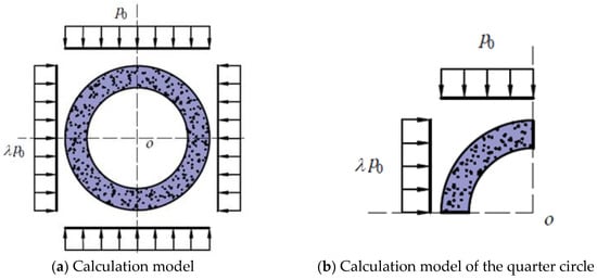 According to the symmetry of the lining and external loads, the quarter circle is considered. Therefore, the calculation model is as shown in Figure 3.
