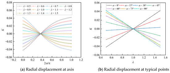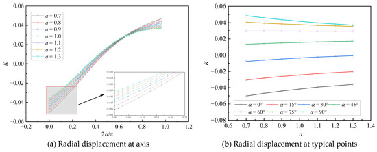 As can be observed from Figure 4a, with the increase in a, the radial displacement at the lining axis decreases, but the deformation trend of the lining is consistent with the maximum displacement at and and the minimum displacement near . In addition, from Figure 4b, with the increase in a, the slope of the radial displacement curve of each typical point decreases gradually. It shows that the increase in a can enhance the stiffness of the lining, but the reduction in deformation becomes smaller and smaller.
